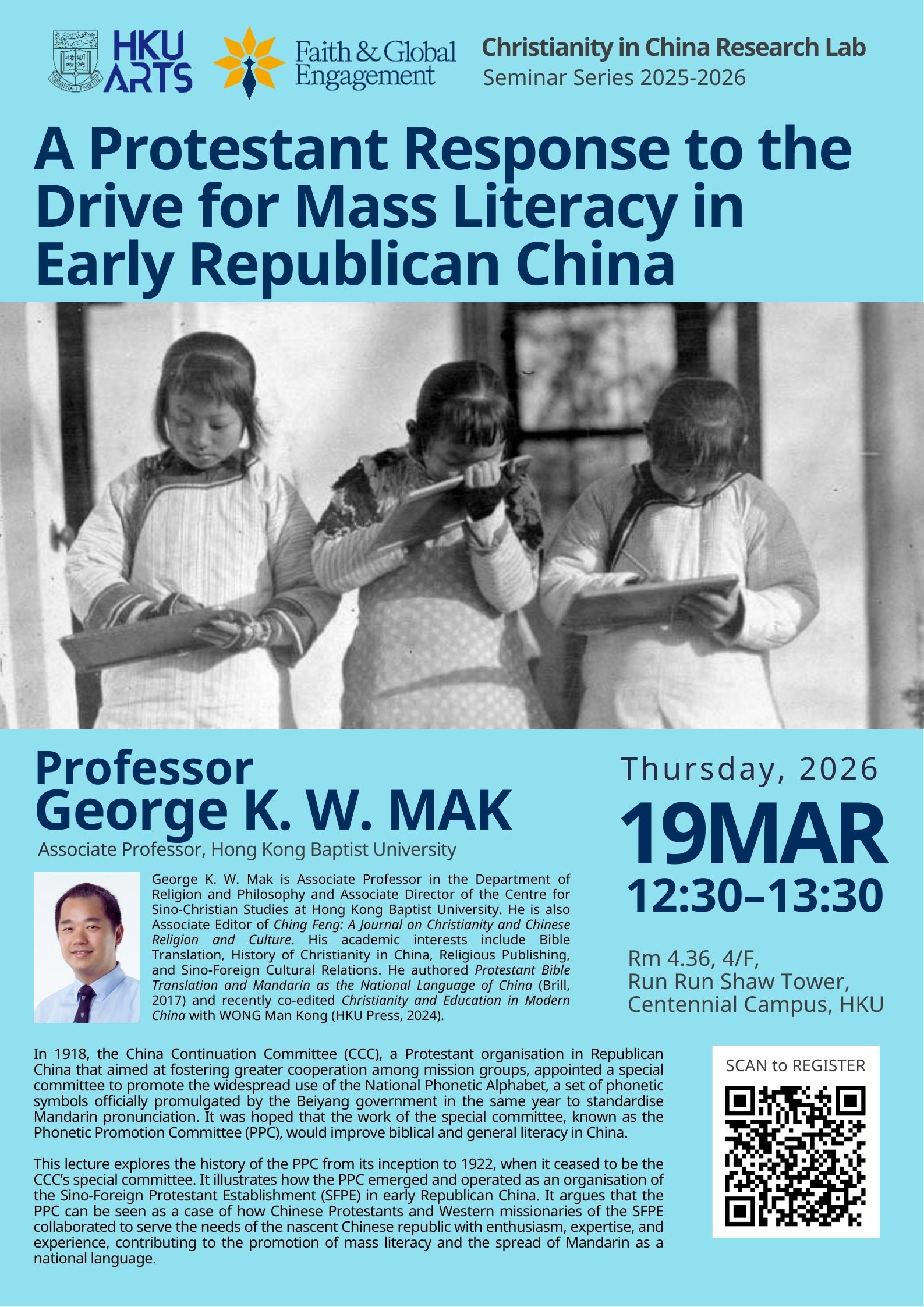 George K. W. Mak is Associate Professor in the Department of Religion and Philosophy and Associate Director of the Centre for Sino-Christian Studies at Hong Kong Baptist University. He is also Associate Editor of Ching Feng: A Journal on Christianity and Chinese Religion and Culture. His academic interests include Bible Translation, History of Christianity in China, Religious Publishing, and Sino-Foreign Cultural Relations. He authored Protestant Bible Translation and Mandarin as the National Language of China (Brill, 2017) and recently co-edited Christianity and Education in Modern China with WONG Man Kong (HKU Press, 2024).